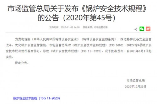 近日,市場(chǎng)監(jiān)管總局在官方網(wǎng)站上發(fā)布了《鍋爐安全技術(shù)規(guī)程》(TSG11-2020)的公告。該規(guī)程將于2021年6月1日正式實(shí)施,《鍋爐安全技術(shù)監(jiān)察規(guī)程》(TSG G0001—2012)、《鍋爐設(shè)計(jì)文件鑒…